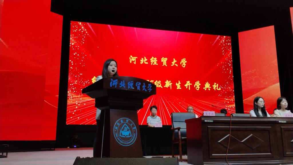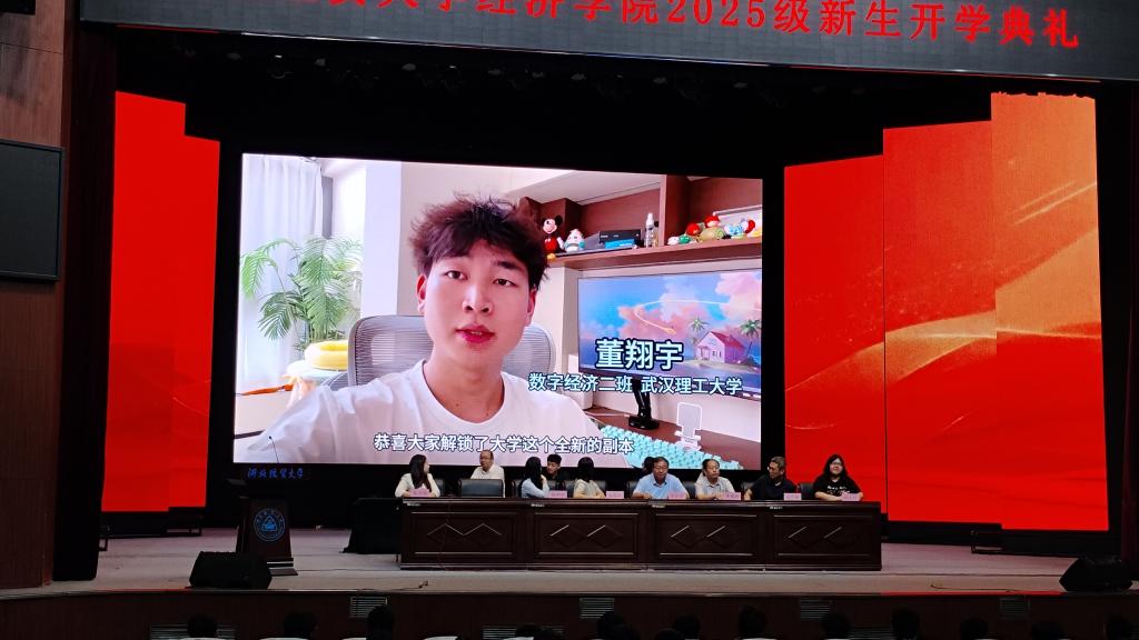 紧接着,2023级国际经济与贸易专业、第21届学生会主席霍润泽作为在校生代表发言。他结合自身在经济学院的学习与工作经历,鼓励新生坚定信念,珍惜时光,投身实践,锤炼品德,肩负时代使命。同时,他希望大家能快速融入经院大家庭,共同成长进步。
