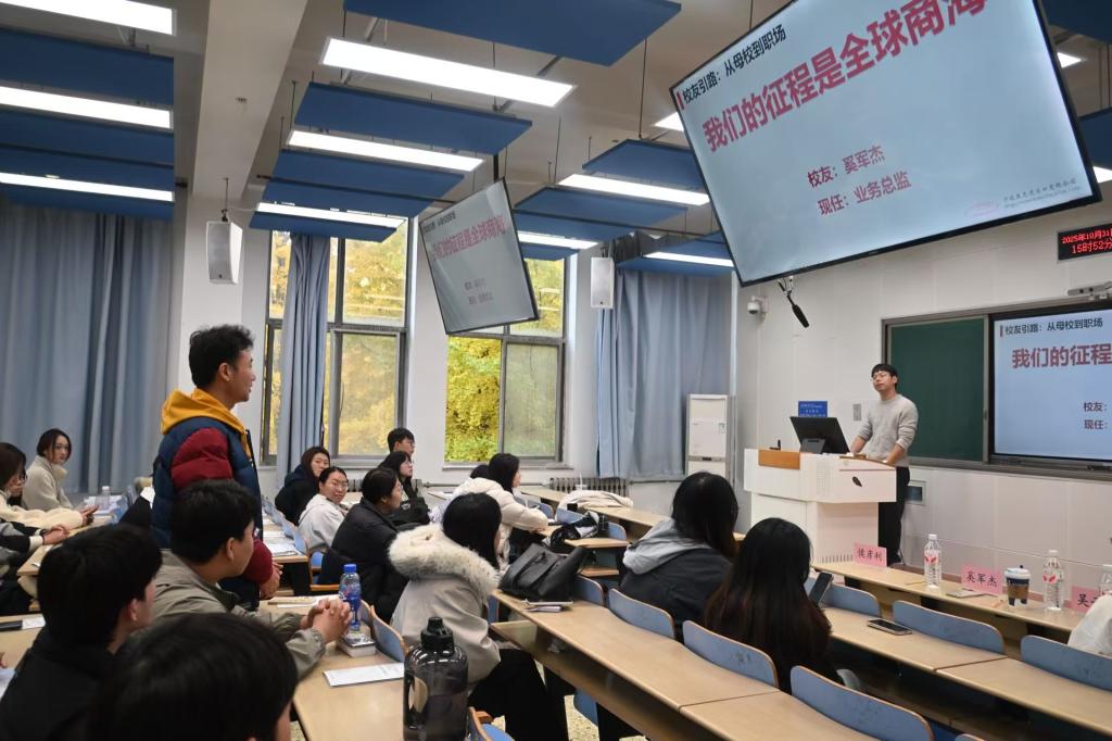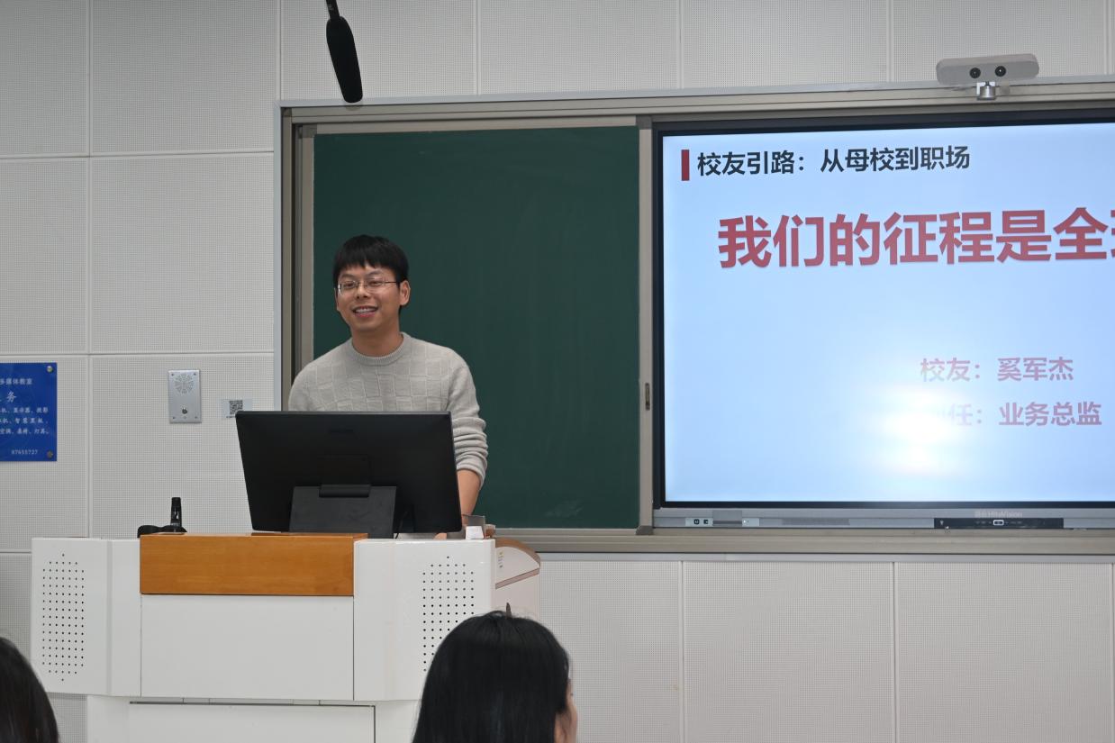 随后,奚军杰立足自身从校园人向外贸从业者的蜕变历程,他强调,顺利完成校园与职场的角色转换,关键在于以严谨务实的态度筑牢职业根基。他从业务一线视角出发,生动解读了所在公司的特色培养体系、清晰的职业晋升通道及广阔的发展前景,为毕业生描绘出清晰的职业蓝图。针对大学阶段的学习规划,他特别建议同学们要合理安排时间、保持持续学习,为未来的职业发展蓄力赋能。为毕业生描绘了清晰的职业蓝图。