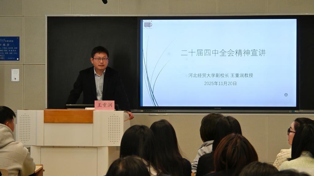 11月20日下午,党委常委、副校长王重润为经济学院联系班级宣讲党的二十届四中全会精神,经济学院2025级国际经济与贸易四班全体学生、经济学院党委副书记侯彦利、辅导员吴子雨参会。