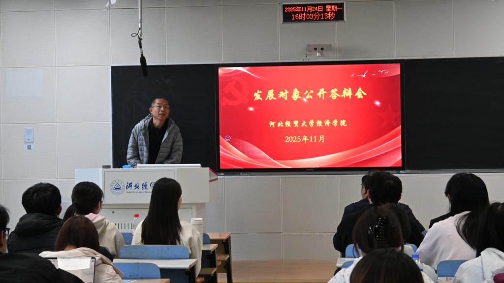 据《中共河北经贸大学经济学院委员会关于在接收预备党员过程中实行公开答辩制度的实施办法(试行)》,11月24日,经济学院在北三教B303、B304、B308举办了发展对象公开答辩会。答辩会分三组进行,经济学院党委书记刘振滨、党委委员赵培红、杜颖、郎郸妮、专职组织员、学生党支部书记、入党介绍人及党员代表和入党积极分子参加,32名发展对象依次进行了答辩。
