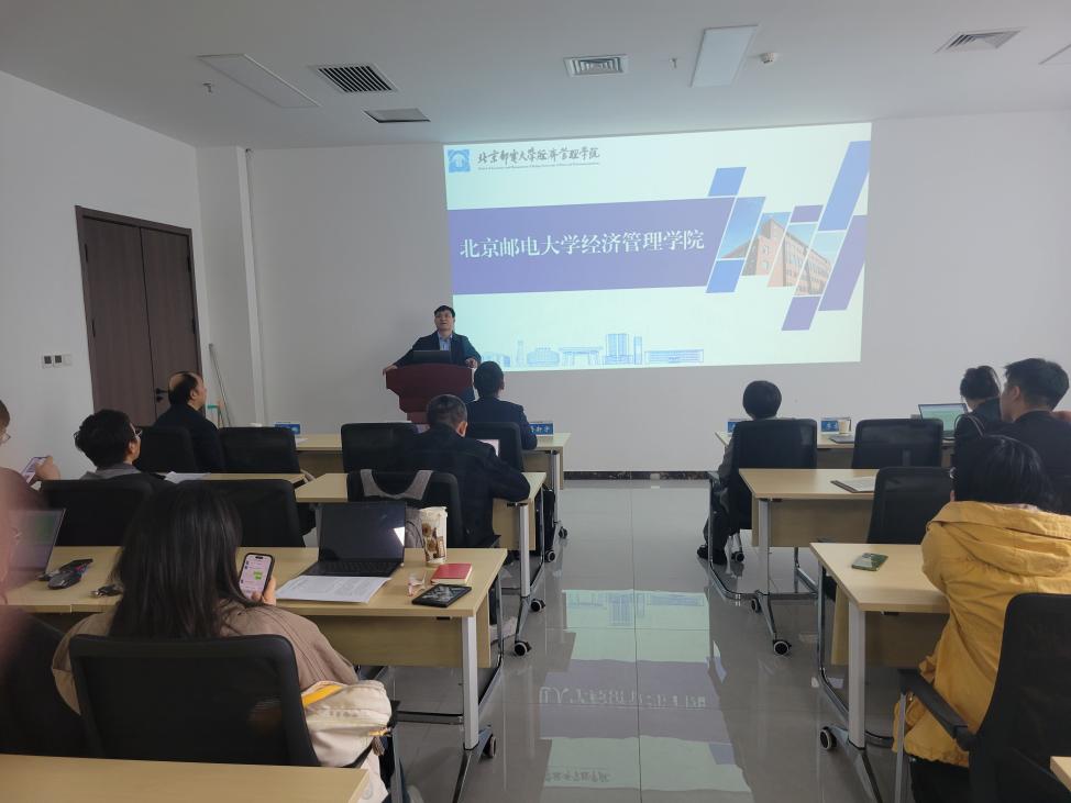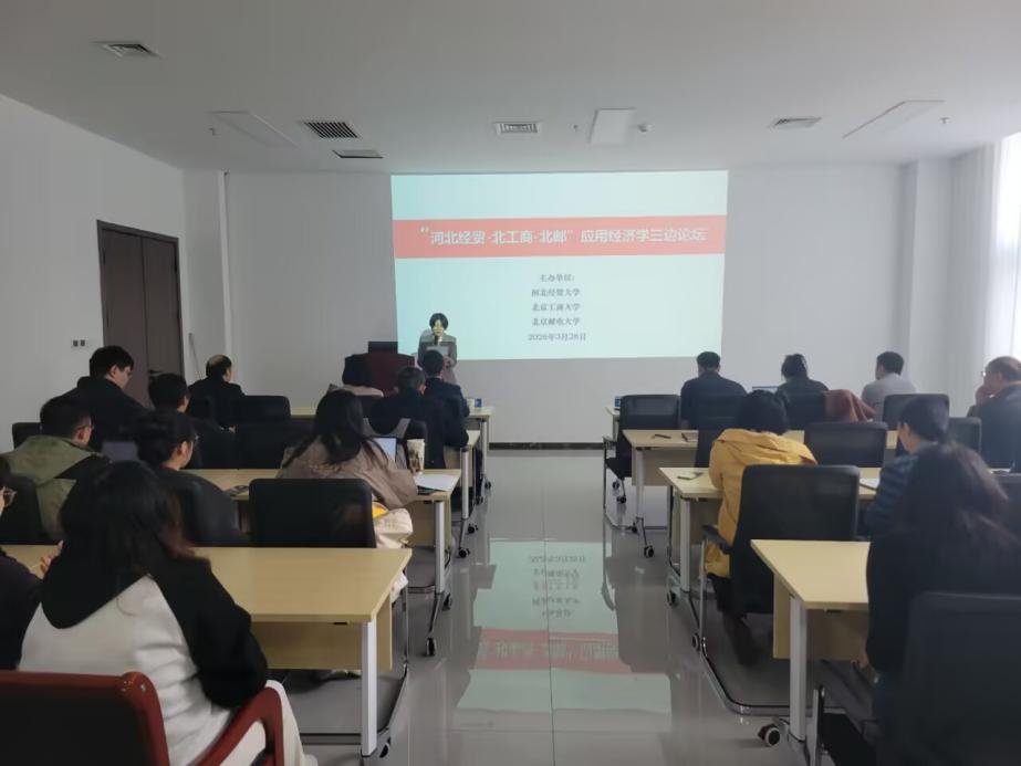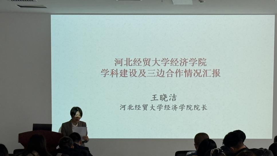 3月28日,“河北经贸-北工商-北邮”应用经济学三边论坛在河北经贸大学数字经济创新中心召开。本届论坛由河北经贸大学经济学院、北京工商大学经济学院和北京邮电大学经济与管理学院共同主办,由河北经贸大学经济学院承办。北京工商大学经济学院执行院长詹新宇教授、河北经贸大学经济学院院长王晓洁教授、北京邮电大学经济与管理学院副院长李宏兵教授、河北经贸大学经济学院教学副院长单海鹏副教授、河北经贸大学经济学院科研副院长王法涛副教授、北京工商大学金融系教师党支部书记贾君怡副教授、北京工商大学经济学院国际经济贸易系副主任徐芬老师出席本次会议。河北经贸大学经济学院教师、系主任以及2025级应用经济学专业部分硕士研究生80余人参加本次会议。会议由王晓洁主持。