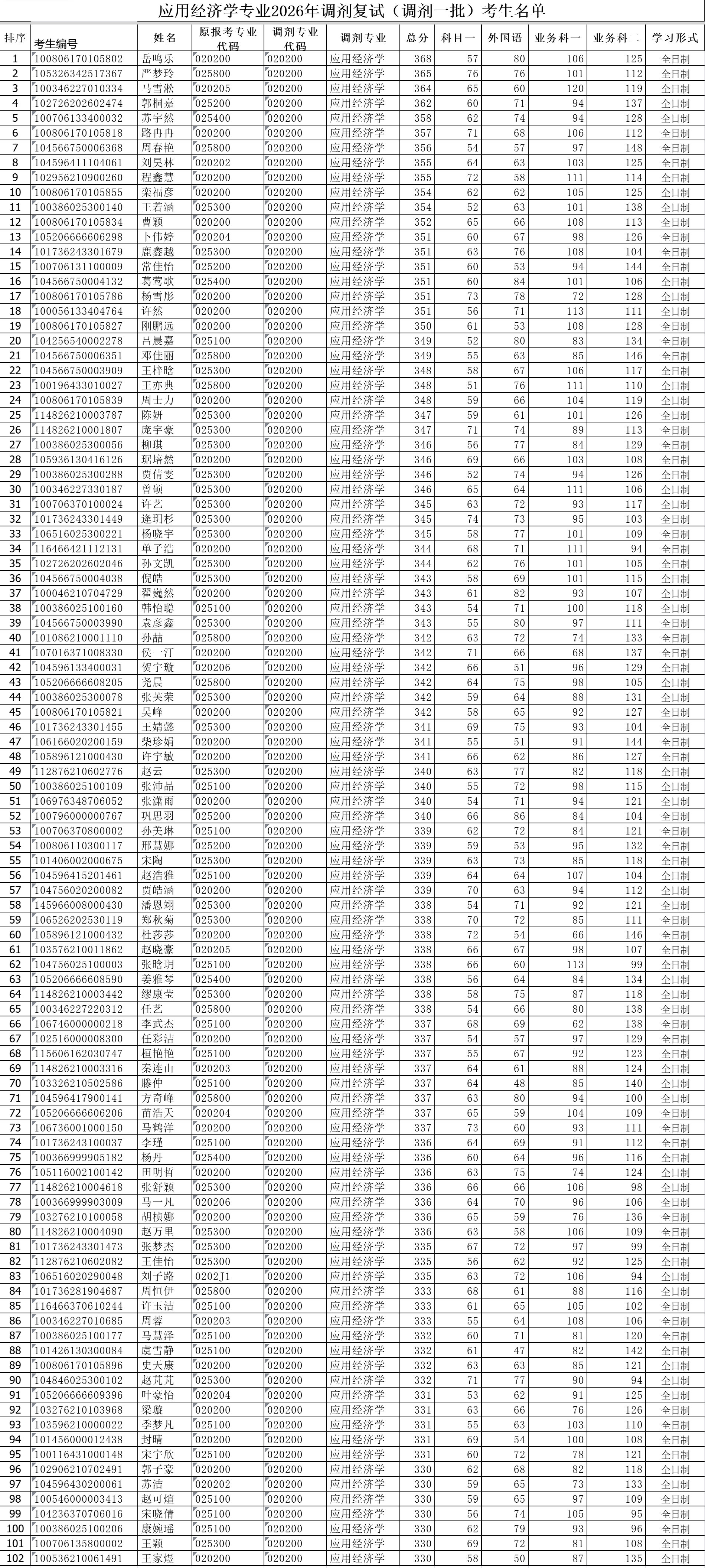 应用经济学专业2026年调剂复试(调剂一批)考生名单