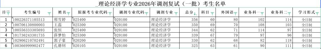 理论经济学专业2026年调剂复试(一批)考生名单