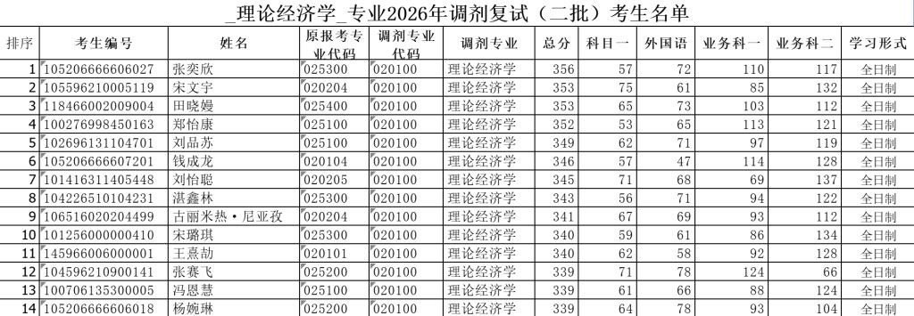 经济学院2026年硕士研究生复试结果及拟录取名单(批次调剂1批)